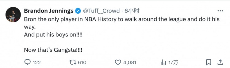 7月12日讯 今天,前NBA球员布兰登-詹宁斯更新了社媒,谈到了詹姆斯。